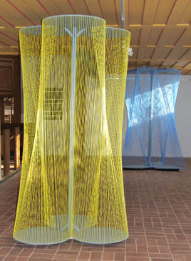 Linearis 1 und 2; Objekt aus Spanplatte + Holzkonstruktion lackiert + gelbes Kunststoffseil; 1,35m x 1,35 m; Höhe 2,4 m; Ausstellungsansicht "Take five"; St. Laurentius Kirche, Schönberg M-V; 2018