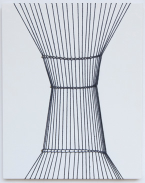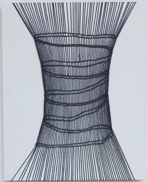Aus parallel gespannten Fäden und ihrer nachfolgenden Verknüpfung miteinander entstehen zeichnerische Arbeiten. Ausgehend von der Zeichenserie "gestrickt-gezeichnet" wird in der Arbeit "Fadenspannungen" der Faden selbst zum zeichnerischen Mittel. |