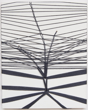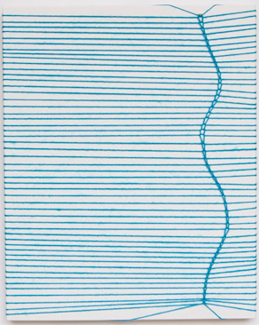 Aus parallel gespannten Fäden und ihrer nachfolgenden Verknüpfung miteinander entstehen zeichnerische Arbeiten. Ausgehend von der Zeichenserie "gestrickt-gezeichnet" wird in der Arbeit "Fadenspannungen" der Faden selbst zum zeichnerischen Mittel. |