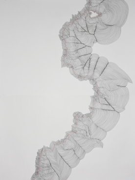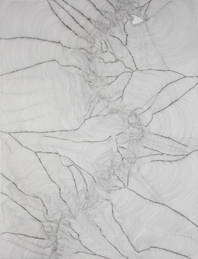 Ich bin diesen Fragen und dieser Grenze "nachgegangen", habe ihren Verlauf vor Ort gesucht. Dort untersuche ich ihr Größenverhältnis zur Linie in der Karte mit fotografischen Mitteln und später verschiedene Übergänge entlang der Grenze zeichnerisch im Atelier. Ebenso, wie sie vor Ort zum Teil sehr schwer genau wahrzunehmen ist, verschwindet sie über den zeichnerischen Prozess auch auf dem Papier.