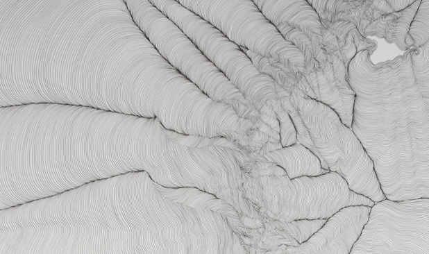 Ich bin diesen Fragen und dieser Grenze "nachgegangen", habe ihren Verlauf vor Ort gesucht. Dort untersuche ich ihr Größenverhältnis zur Linie in der Karte mit fotografischen Mitteln und später verschiedene Übergänge entlang der Grenze zeichnerisch im Atelier. Ebenso, wie sie vor Ort zum Teil sehr schwer genau wahrzunehmen ist, verschwindet sie über den zeichnerischen Prozess auch auf dem Papier.