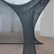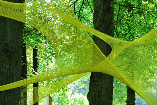 Das "Raumgestrick im Park" ist das erste seiner Art im Außenraum. Die Raumgestricke sind immer mit ihrem Standort verbunden und erhalten erst im Zusammenspiel mit diesem ihre Form. Es ensteht ein Wechselspiel zwischen Stabilität und Flexibilität und 2 -und 3-Dimensionalität. Im "Raumgestrick im Park" erhält dieses seine Stabilität über die Büume, zwischen denen es sich aufspannt, bleibt aber zugleich trotz seiner Größe ein flexibles und filigranes Gebilde, dass sich ebenso wie die Bäume selbst immer mehr "verzweigt". |