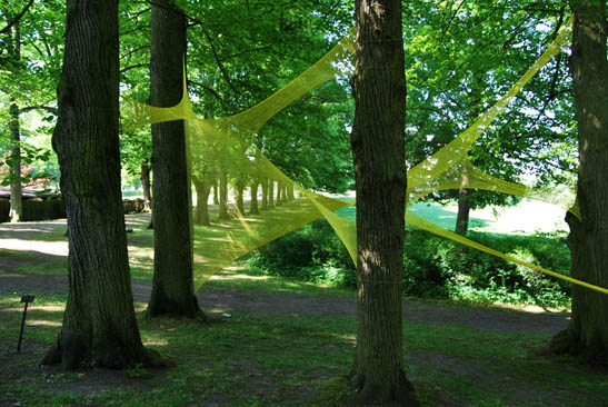 Das "Raumgestrick im Park" ist das erste seiner Art im Außenraum. Die Raumgestricke sind immer mit ihrem Standort verbunden und erhalten erst im Zusammenspiel mit diesem ihre Form. Es ensteht ein Wechselspiel zwischen Stabilität und Flexibilität und 2 -und 3-Dimensionalität. Im "Raumgestrick im Park" erhält dieses seine Stabilität über die Büume, zwischen denen es sich aufspannt, bleibt aber zugleich trotz seiner Größe ein flexibles und filigranes Gebilde, dass sich ebenso wie die Bäume selbst immer mehr "verzweigt". |